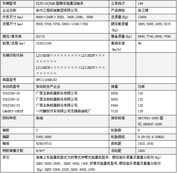 江淮隨車起重運(yùn)輸車  底盤型號:HFC1132KR1K3 額定質(zhì)量:3865,5065,4265,5215